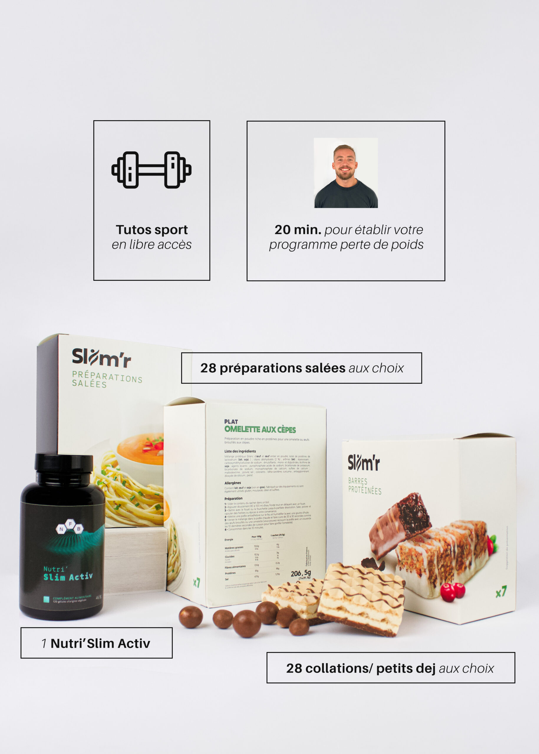 Une box complète qui vous permettra de changer votre mode de vie. De nourrir et soulager votre corps par les nutriments dont il a besoin.  56 repas au choix, à vous de les utiliser selon les conseils de votre expert par téléphone. En compléments de cela, afin d’avoir des résultats plus rapides la prise du slim active journalière viendra booster votre métabolisme afin de brûler plus de calories.