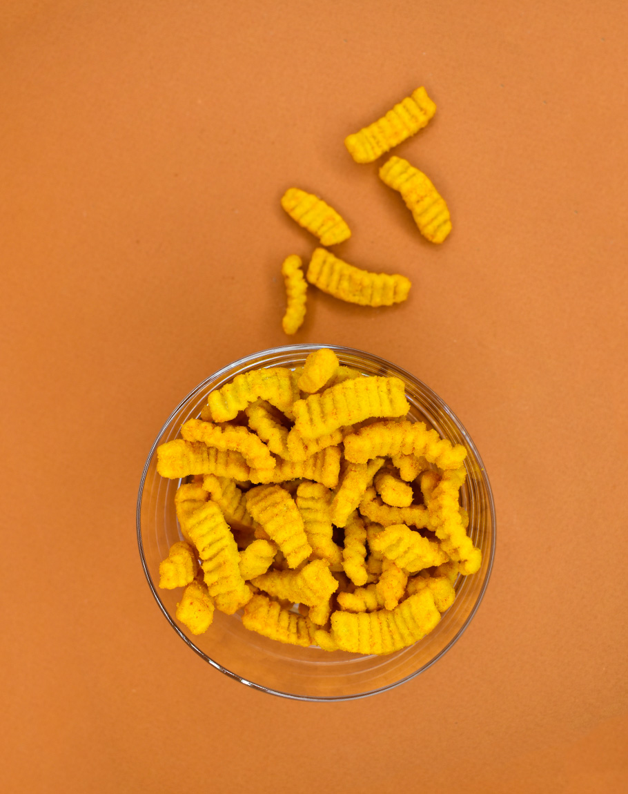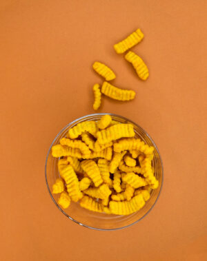 Snack protéiné * (protéines de soja, farine de pomme de terre, farine de soja, amidon de pomme de terre, carbonate de calcium) ; huile de tournesol ; protéines végétales ; extrait de levure ; sel ; légumes déshydratés (oignon, tomate, ail) ; diacétate de sodium ; arôme * (céleri) ; épices ; anticaking agent : silicon dioxide ; acidity regulator : citric acid.